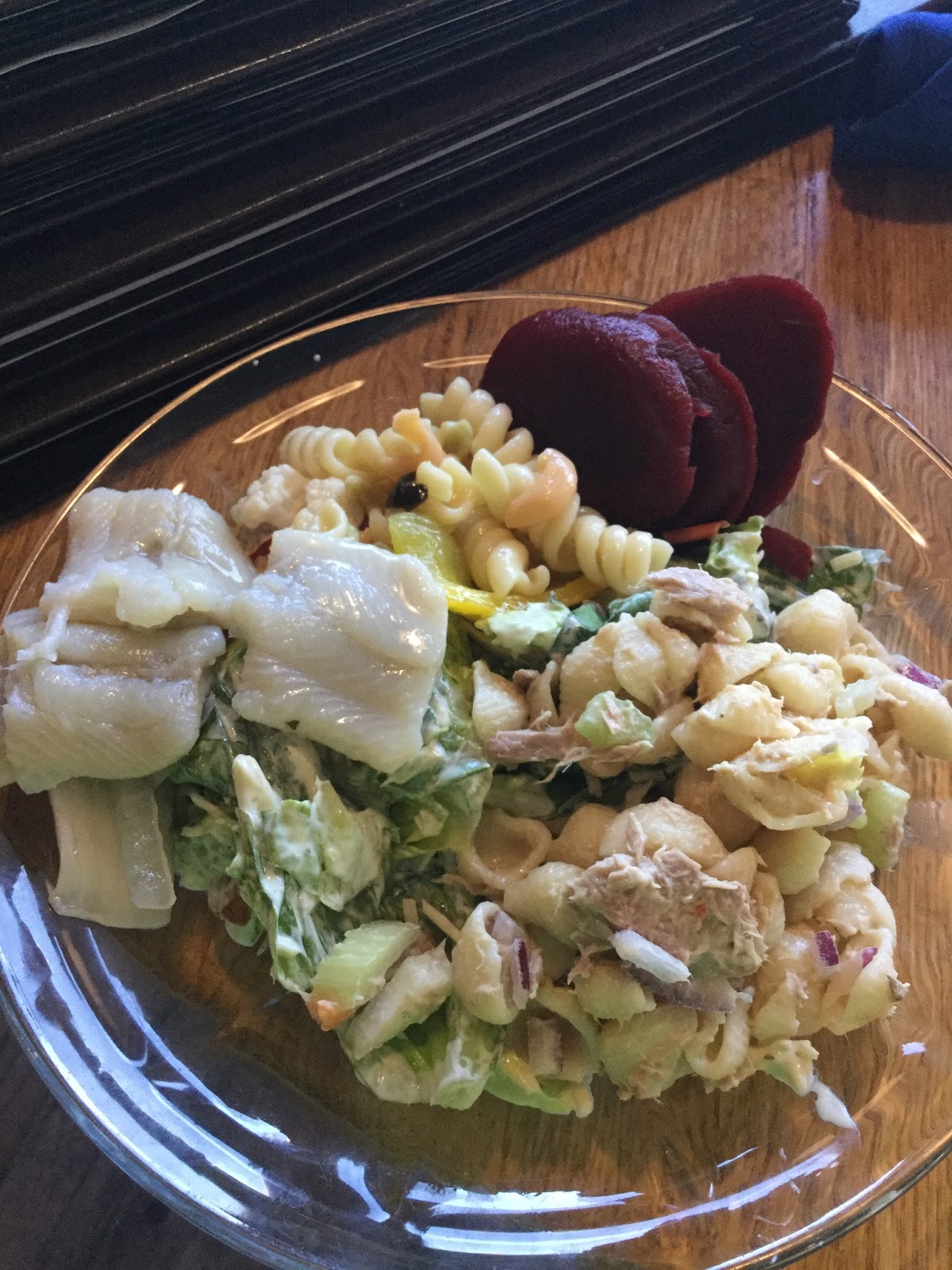 My traveling companions Tim, Ty, and Troy with a typical plate from the Barkers Island Inn salad bar...